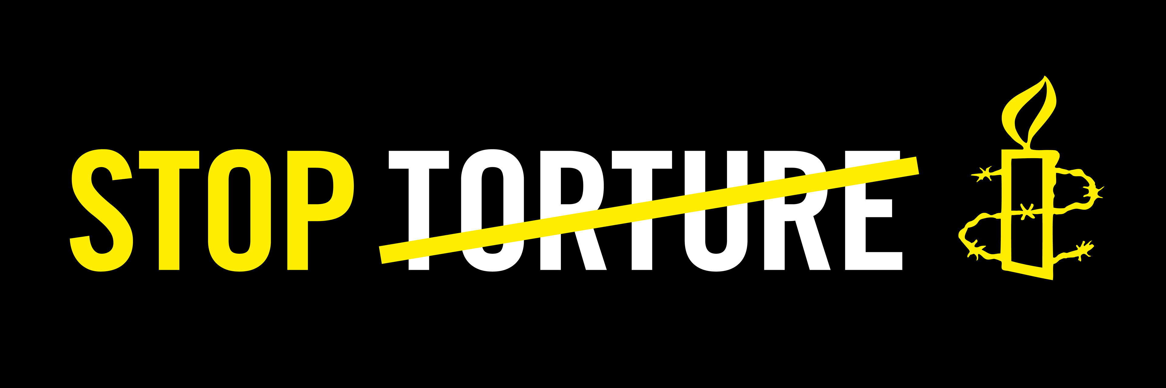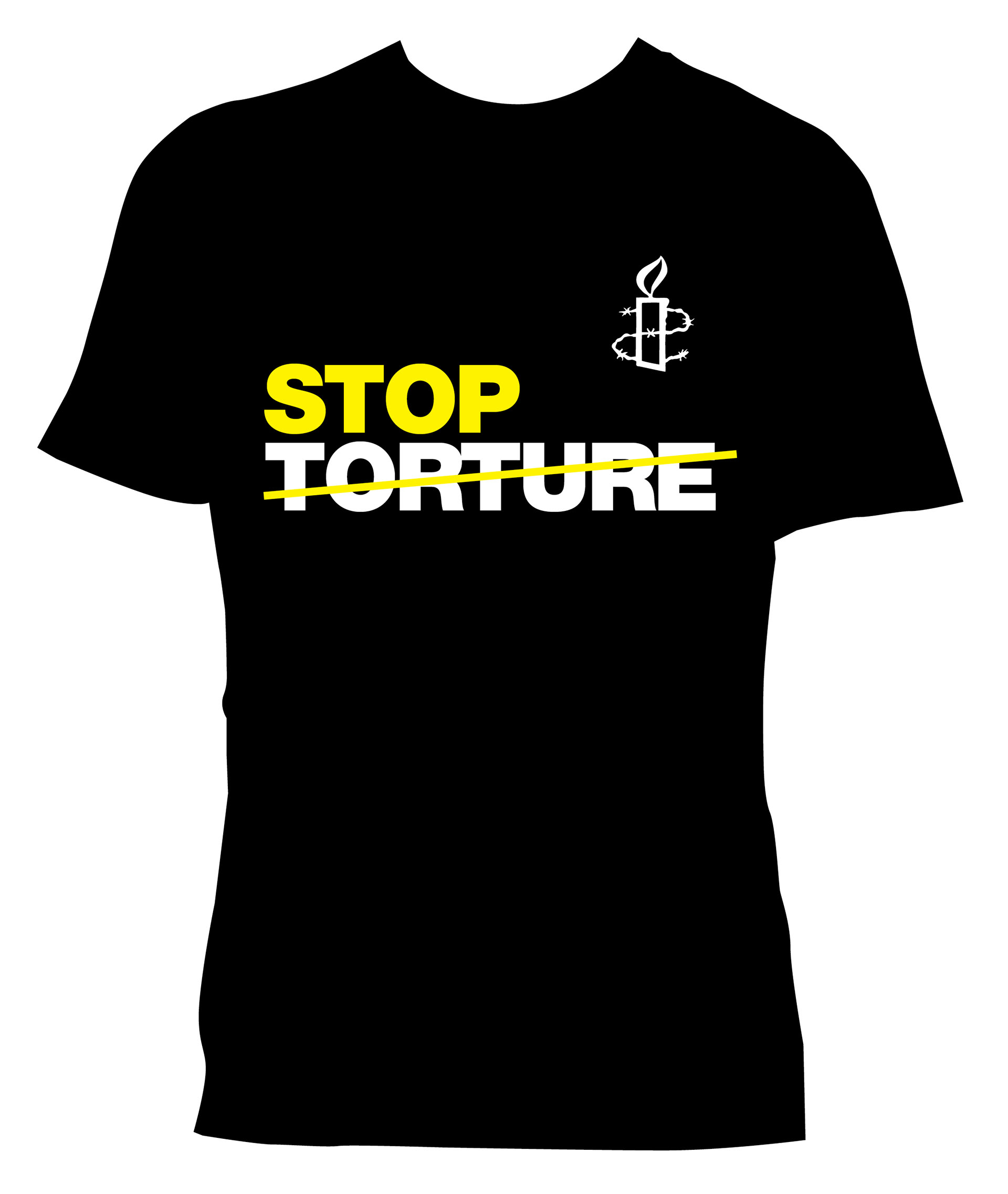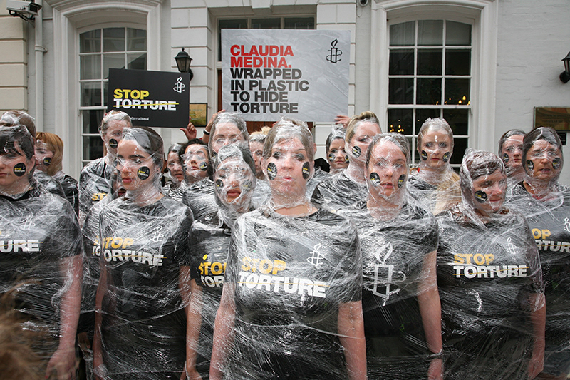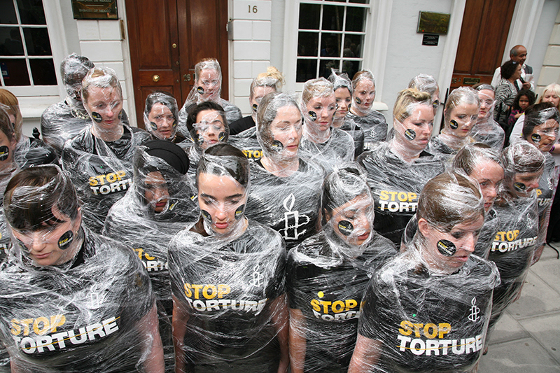 Amnesty International UK's 'Stop Torture' campaign materials used for protests.